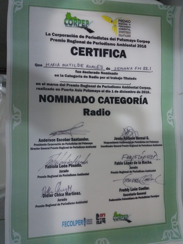 Maria Matilde Ruales Diaz quien produce el espacio de Romantica stereo Semana Fm los Sabados de 7 :00 am a 9:00 se alzo con El Premio de Periodismo Ambiental de la Corporación de Periodistas del Putumayo (Corpep), este un reconocimiento a los periodistas que con su trabajo contribuyen a la conservación del medio ambiente en Putumayo. Corpep, apoyado de otras instituciones, resaltaróel trabajo de los periodistas de la región sur del país, que se hayan enfocado en temáticas ambientales y ecológicas: biodiversidad, cuencas hídricas, reservas naturales, fauna y flora, daños ambientales, innovación ambiental, historias de vida, denuncias, entre otros.