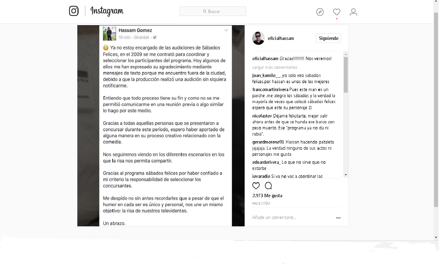 A través de su cuenta en Instagram, Gerly Hassam Gómez, más conocido como Hassam, reveló que ya no está al frente de las audiciones y rutinas del programa Sábados Felices de Caracol Televisión, cargo que desempeñaba desde 2009. Al parecer, la producción habría realizado la audición sin el consentimiento del humorista.