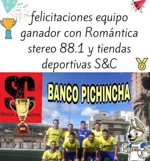 El equipo de futbol del Banco Pichincha fue el vencedor del gran concurso realizado por romántica stereo y tiendas deportivas S&C el cual consistía conseguir con su fotografía la mayor cantidad de me gusta o likes ; y ala vez participaban por llevarse los uniformes completos para su equipo de fútbol .Su resultado fue de […]